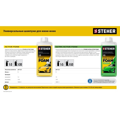 Концентрированный шампунь для мойки ULTRA FOAM с повышенным пенообразованием и возможностью нанесения на кузов автомобиля с помощью пенокомплекта. При небольшом расходе шампуня, бразует стойкую обильную пену, которая остается на поверхности длительное время.